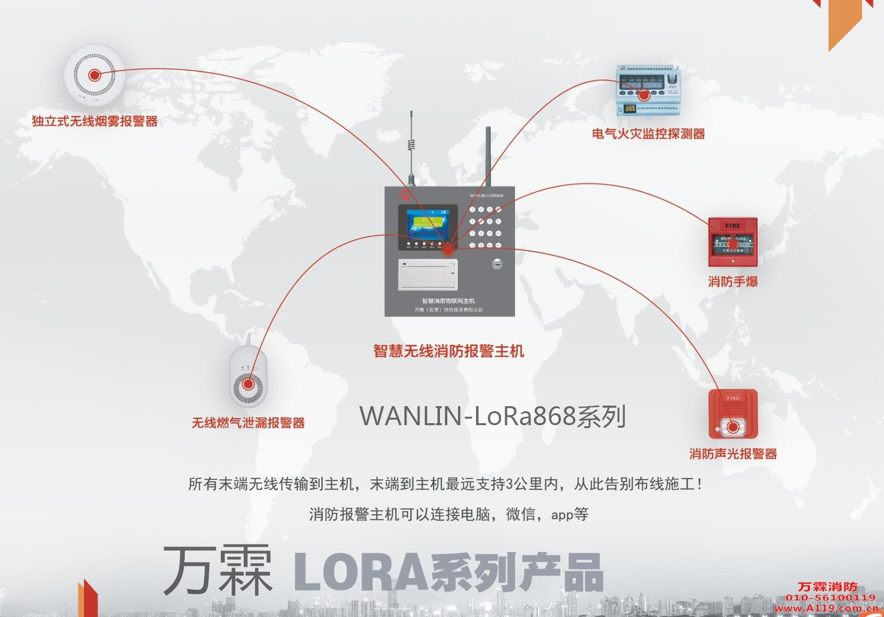 萬霖LoRa868系列是一種主要以實時雙向監測真正做到零漏報零誤報,它可在規定范圍內通過無線的方式傳輸各種火災設備的數據信號,實行遠距離監控,集中管理、及時發現并處理警情。產品可實現報警事件打印TFT液晶顯示防區地址,傻瓜式操作與配件雙向通信等多項技術。該系統可通過特定的通訊格式與消防火警管理中心計算機聯網,組成一套先進的全方位科學技術安全防范網絡。一旦發生警情,能把報警信息通過通訊網絡瞬間遠程傳輸到用戶設定的電話、手機。同時向接警中心報告,聯網中心電腦可通過電子地圖、數據庫、電腦語音提示,顯示發生警情的單位、地址、方位、及時調動警力作出處理。該報警系統廣泛應用于九小場所、三合一場所防火、緊急求助的自動報警。可獨立使用,也可與街道辦智慧管理中心組成聯網。